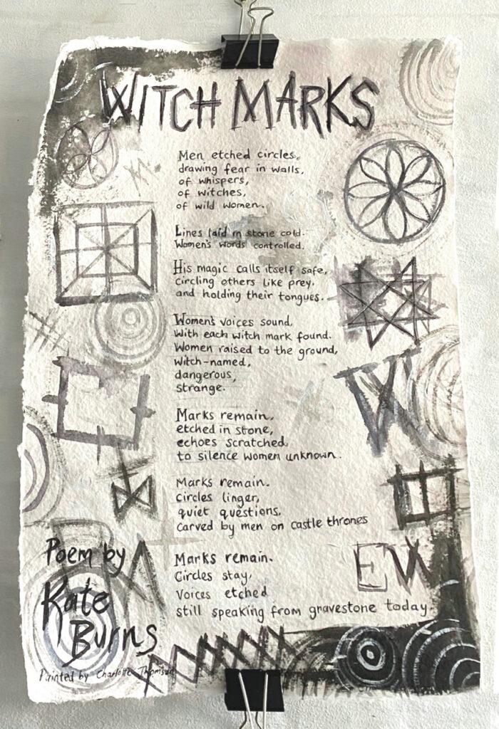 A series of Mono-prints based on protective apotropaic ‘Witch Marks’ found at Nottingham & East Midlands Historic Sites (Including Creswell Craggs & Belton House). An exploration of superstition, religious symbology and fear of Witchcraft, linking to and encouraging discussion on the Witch Trials in the United Kingdom.